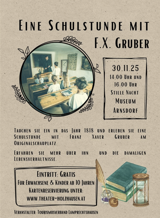 Tauchen Sie ein in das Jahr 1818 und erleben Sie eine ganz besondere Zeitreise: Im historischen Schulzimmer des Stille-Nacht-Museums Arnsdorf wird Franz Xaver Gruber, der Komponist des